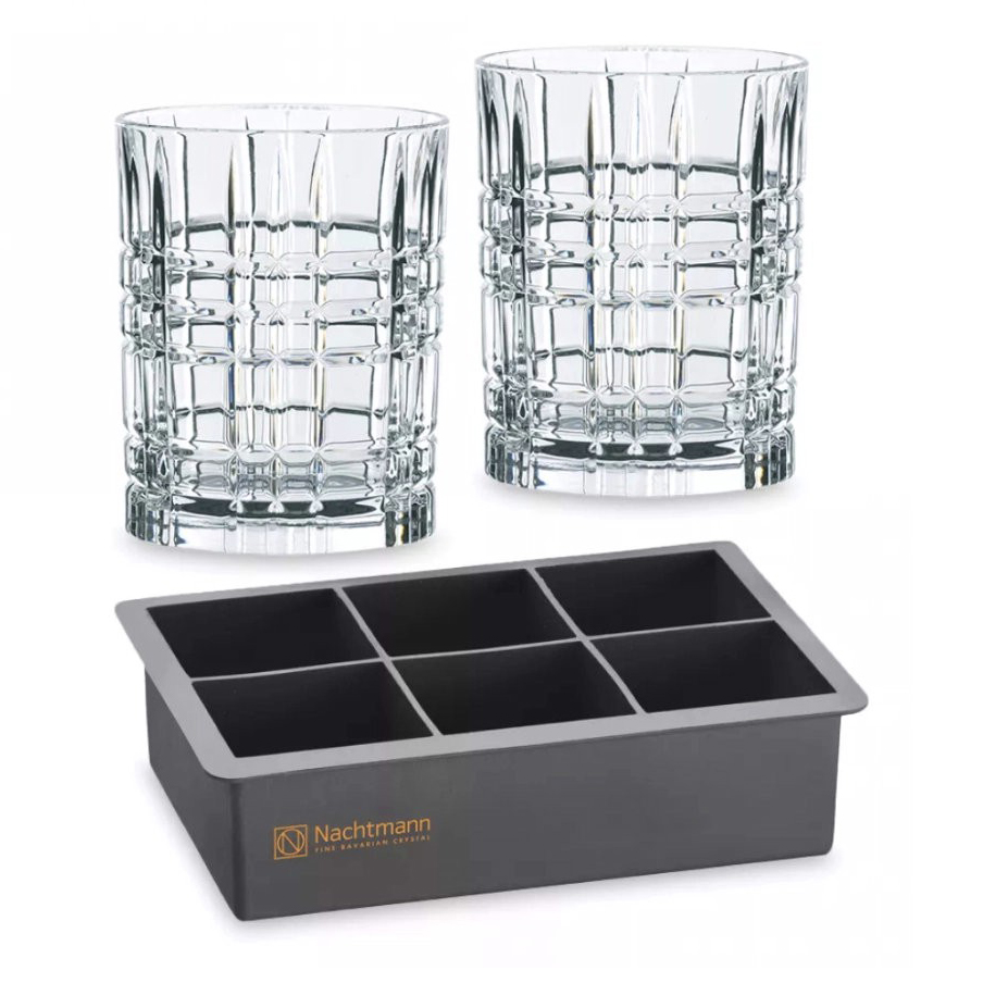 Набор стаканов для виски: 2 низких стакана (345 мл) и форма для льда (119 x 82 мм, 6 кубиков), хрустальное стекло, Square Ice Cube, Nachtmann